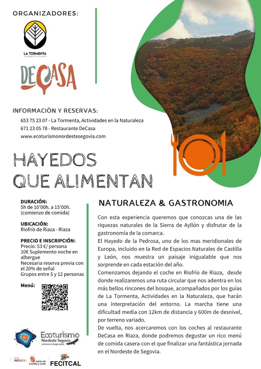 El punto de partida es Riofrío de Riaza, desde donde realizaremos una ruta guiada circular de 12 km por el mágico Hayedo de la Pedrosa, acompañados por los expertos guías de La Tormenta, Actividades en la Naturaleza.